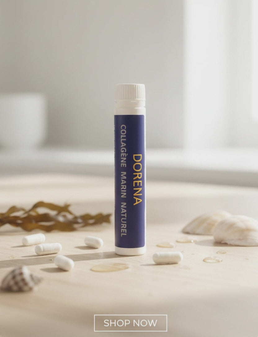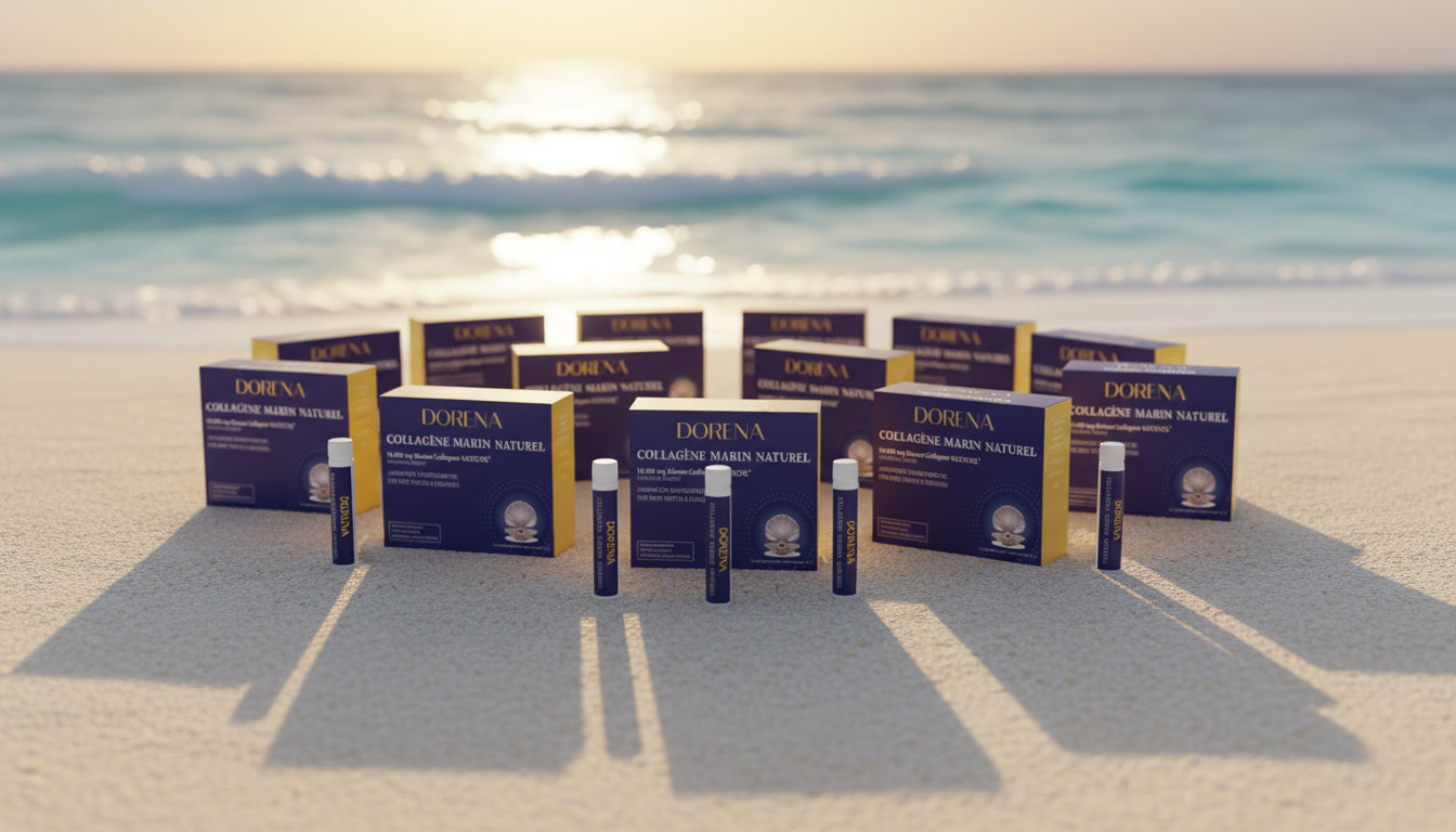 Dorena Collagène Marin Naturel is a premium marine collagen supplement containing 10,000 mg Naticol® collagen peptides plus essential vitamins and minerals that support skin beauty, elasticity and hydration from within.